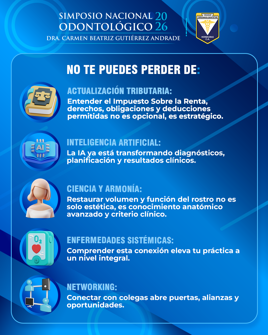 Actualización tributaria clave para tu consulta 💼, Inteligencia Artificial aplicada a la odontología estética 🤖, armonización facial con base científica 💉 y la relación entre infecciones odontogénicas y enfermedades sistémicas ❤️🧠.