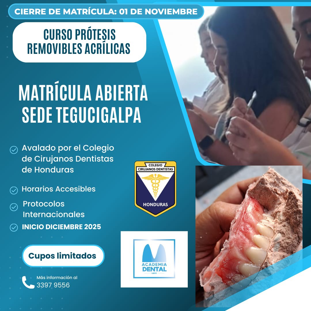 🦷✨ ¡Matrícula Abierta en Tegucigalpa! ✨🦷No te pierdas la oportunidad de especializarte con nuestro Curso de Prótesis Removibles Acrílicas. ✅ Horarios accesibles✅ Protocolos internacionales✅ Cupos limitados 📌 Inicio: Diciembre 2025📅 […]